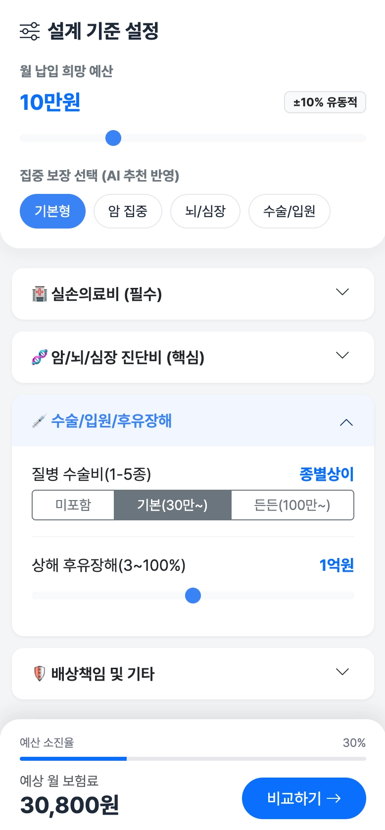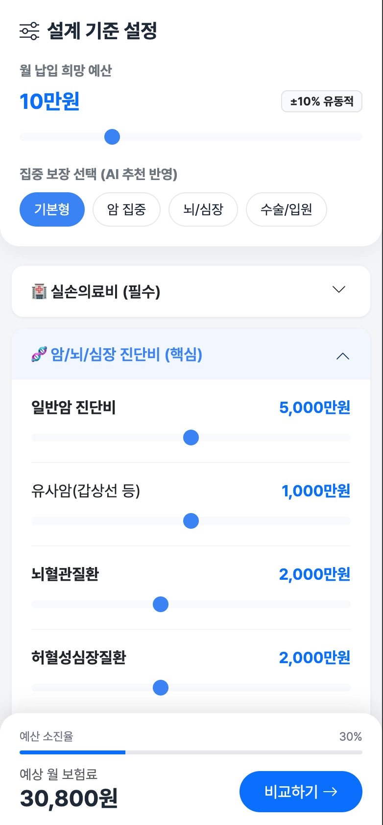 슬라이더 바로 보장 금액 조정 (예: 암 진단비 1천만 원 -> 5천만 원 드래그).