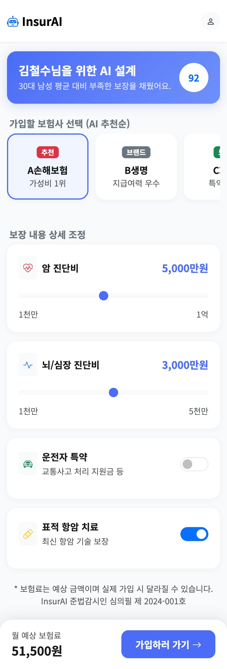 보험료 계산 엔진: 사용자가 보장 금액을 수정할 때 실시간으로 보험료를 재계산(보험사 API 연동 필요).